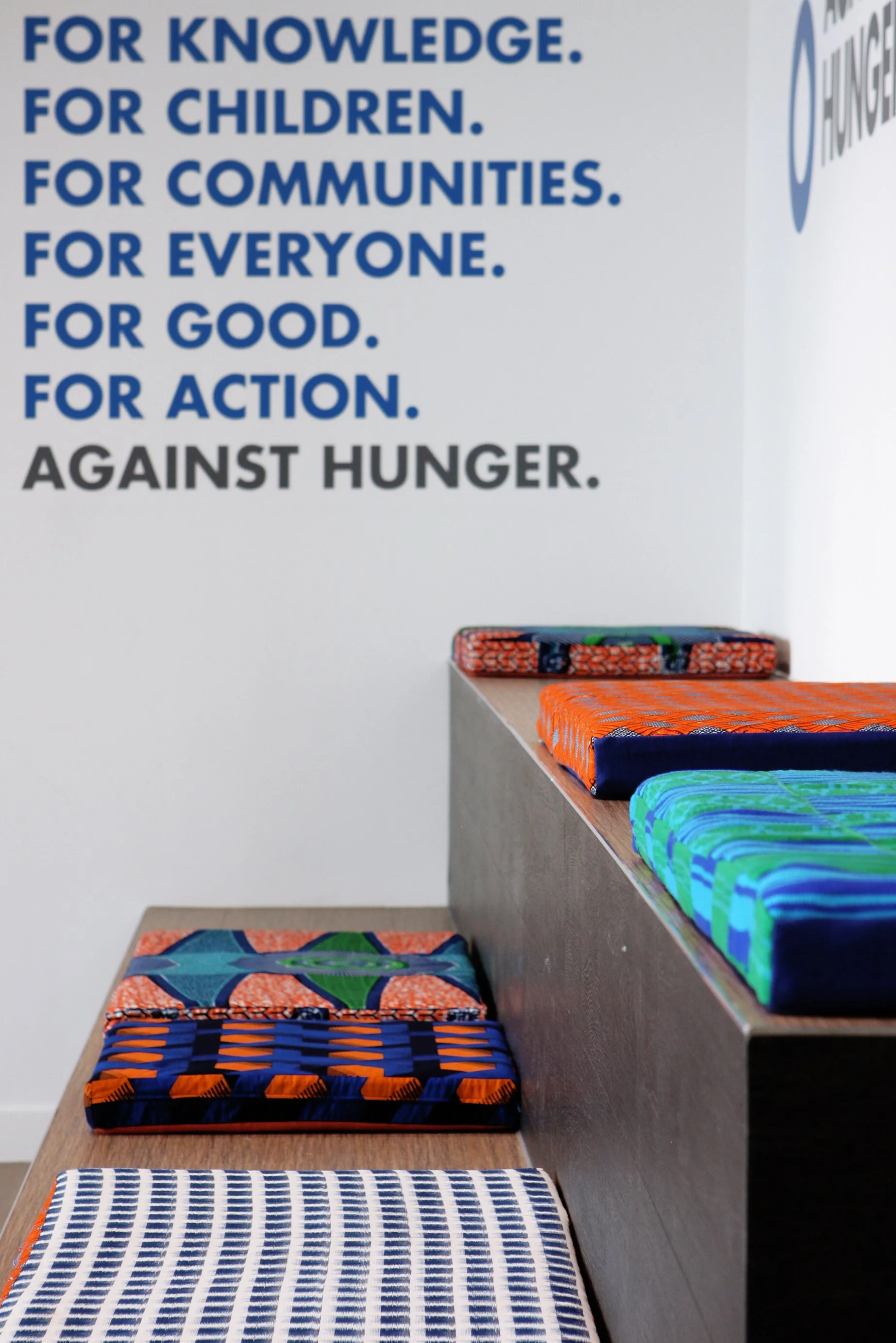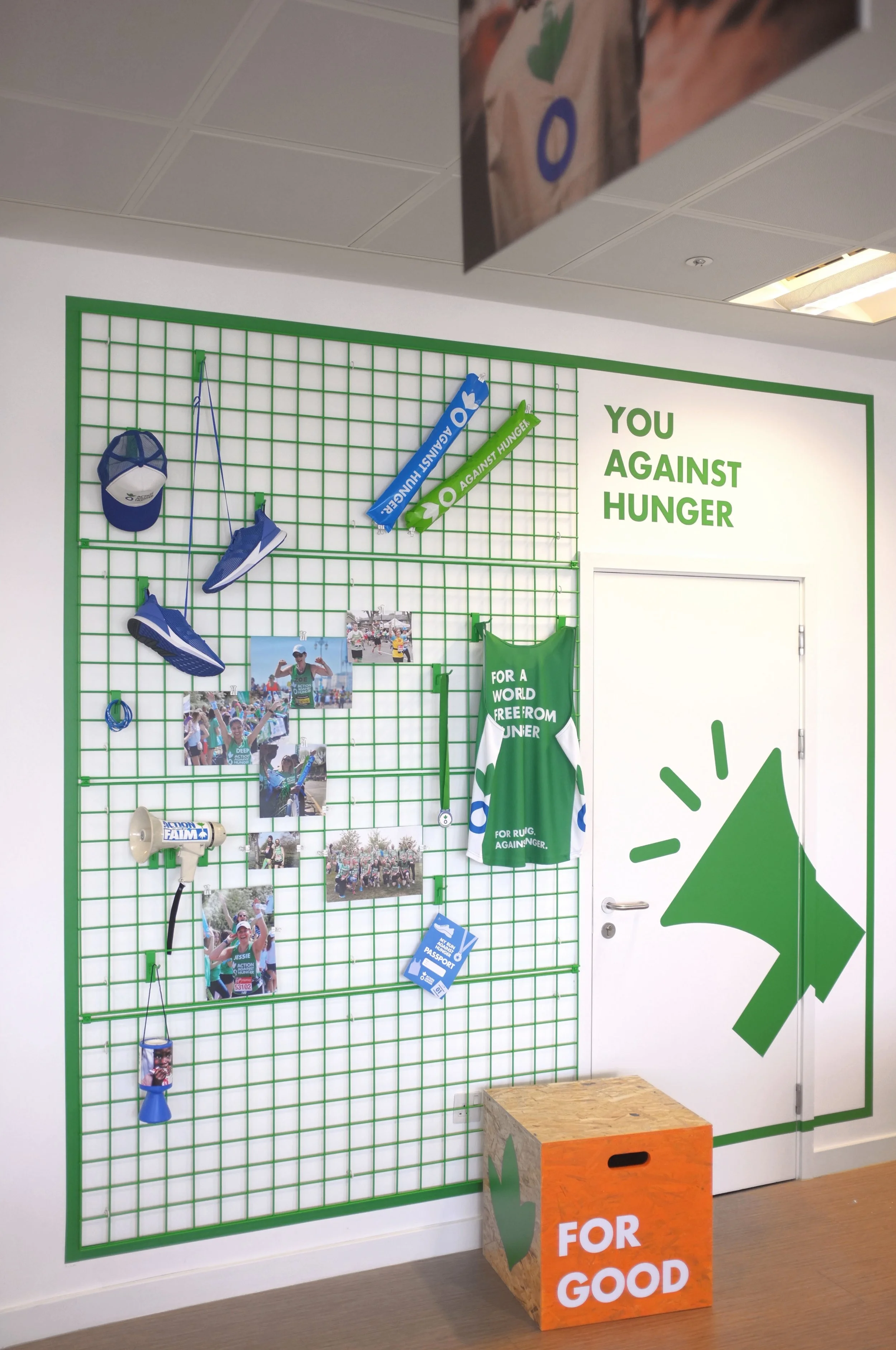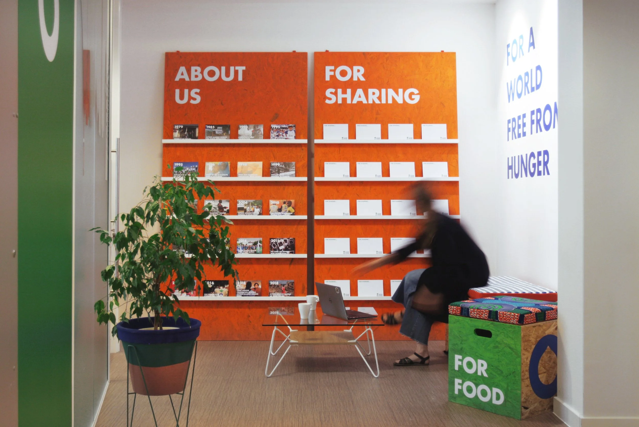 The new site is on the 4th floor of the Mitre Building in North Greenwich. The space benefits from natural daylight and from a central route linking one end of the office to the other affording the space with good sight lines. We worked collaboratively with AAH to create an interactive journey through this space, offering an immersive experience that directly communicates to the team or visitor what it means to be part of Action Against Hunger, what it has achieved, what it’s currently doing and its aims for the future.